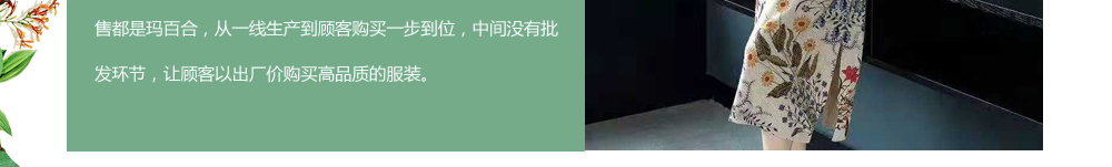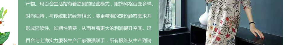 高雅别致的环境,给您以典雅尊贵的享受;时尚靓丽的衣橱给您焕然一新的感觉;服务******的精英导购让您有宾至如归的温馨。玛百合生活馆的成立,是玛玲领航者的智慧激发,是一次经营理念的全新拓展,更是一次服饰行业的时尚******,相信在“玛百合”,您一定会遇见更美的自己。